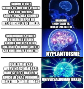 - Nogle romantiske forfattere mener, at de to verdener kan forenes helt i naturen, det handler bare om at se det (Universalromantikken), mens andre mener, at de kun kan forenes i små glimt (nyplatonisme).