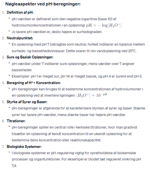 Gennem disse opgaver får eleverne hands-on-erfaring med pH-beregninger og får mulighed for at forstå og anvende disse koncepter i forskellige kontekster. Det fremmer en integreret forståelse af syre-base-kemi og kan forbedre elevernes evne til at analysere og forklare pH-relaterede fænomener.